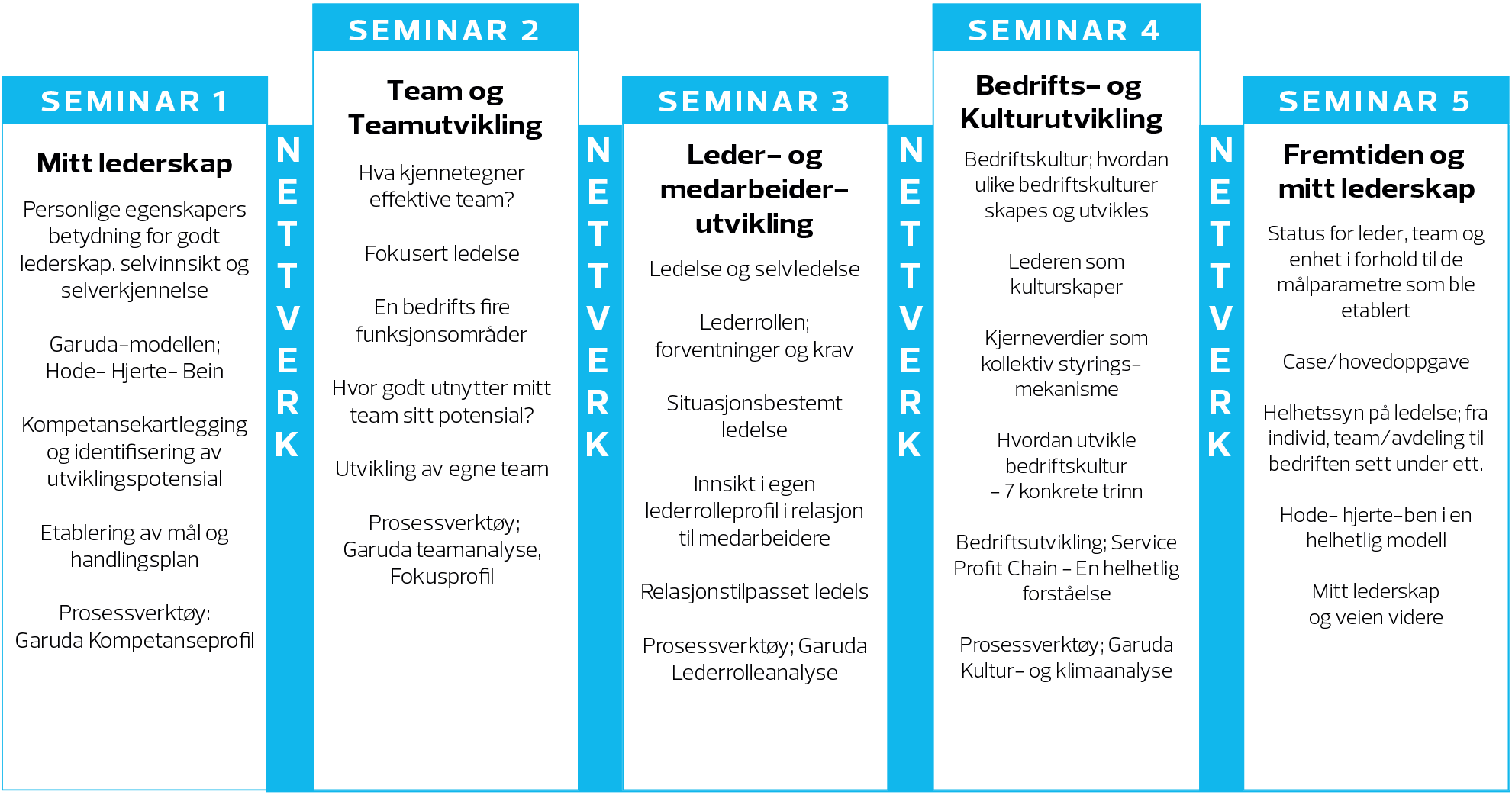 Garuda Lederskoles unike konsept er at det er tilpasset hver enkelt deltager. Gjennom 12 måneder får du en interessant reise og et spesielt innblikk i dine personlige egenskaper som leder, en reise som vil gi deg verdifull kompetanse innen relasjonsledelse. Programmet er bygget opp med 5 moduler som tar deg fra individnivå, gjennom teamnivå og til organisasjonen sett under ett. I tillegg til temabaserte foredrag/ undervisning blir det lagt stor vekt på gruppeprosesser, diskusjonsforum og erfaringsutveksling. Gjennom programmet får hver deltaker personlig oppfølging og coaching gjennom et helt år.
